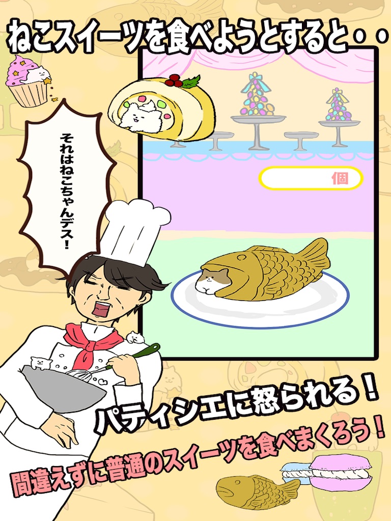 スイーツに紛れ込んでいるねこをよけながらスイーツを食べていこう!