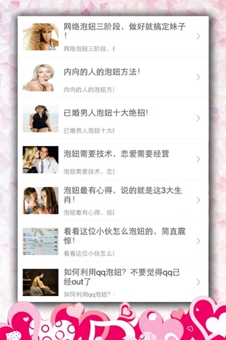 《泡妞秘籍》本软件包含大量的恋爱技巧,泡妞大法,教你如何谈恋爱,如何搞定你喜欢的美女或者帅哥!