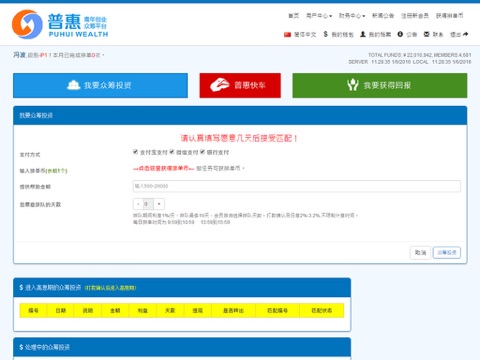 普惠创筹 青年创业众筹平台 项目发起者通过平台发起众筹投资,投资者根据项目进行投资,后期获得回报。