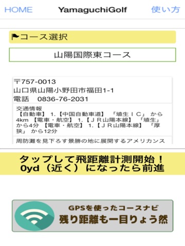 山口県のゴルフコースをナビゲートします。現在5コースを収録しておりますが、随時増えていく予定です。GPSを使ってグリーンやハザードまでの残り距離を表示します。ドライバーショットの飛距離も測定可能です。天候や風向きなどに多少左右されるところはありますのでご承知おきください。