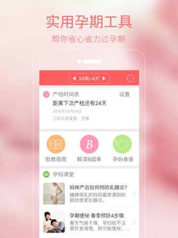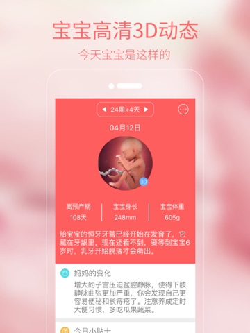 怀孕期助手-准妈妈们的孕期好伴侣!为怀孕和育儿阶段的你提供全方面的服务,帮助千万妈妈顺利度过孕期,陪宝贝一起健康成长!【妈妈指南】准妈妈的孕期困惑、备孕怀孕、胎动产检、孕期禁忌、身体护理、早教等问题,让权威专业的医生帮你解答。【宝宝动态】280天每天呈现宝宝动态视频,模拟真实B超图像,清楚了解宝宝发育,陪宝宝一同成长。【孕妈百科】情感生活,孕期食谱,孕期健康,宝宝辅食喂养等,千万辣妈亲身经验靠谱分享,还有超齐全的母婴问答!【孕期工具】每日更新孕期贴士,教你看懂B超单,还有贴心的孕期体检提醒、胎教指南、产后月子护理等,全方位呵护你和宝宝的身体健康!还在等什么,快来加入我们的宝妈大家庭,体验顺利好孕吧!