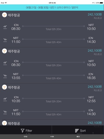 해외출발,다구간 지원, 출도착시간,낮은가격순 등 소트기능과 출발시간대,소요시간 등 강력한 필터기능도