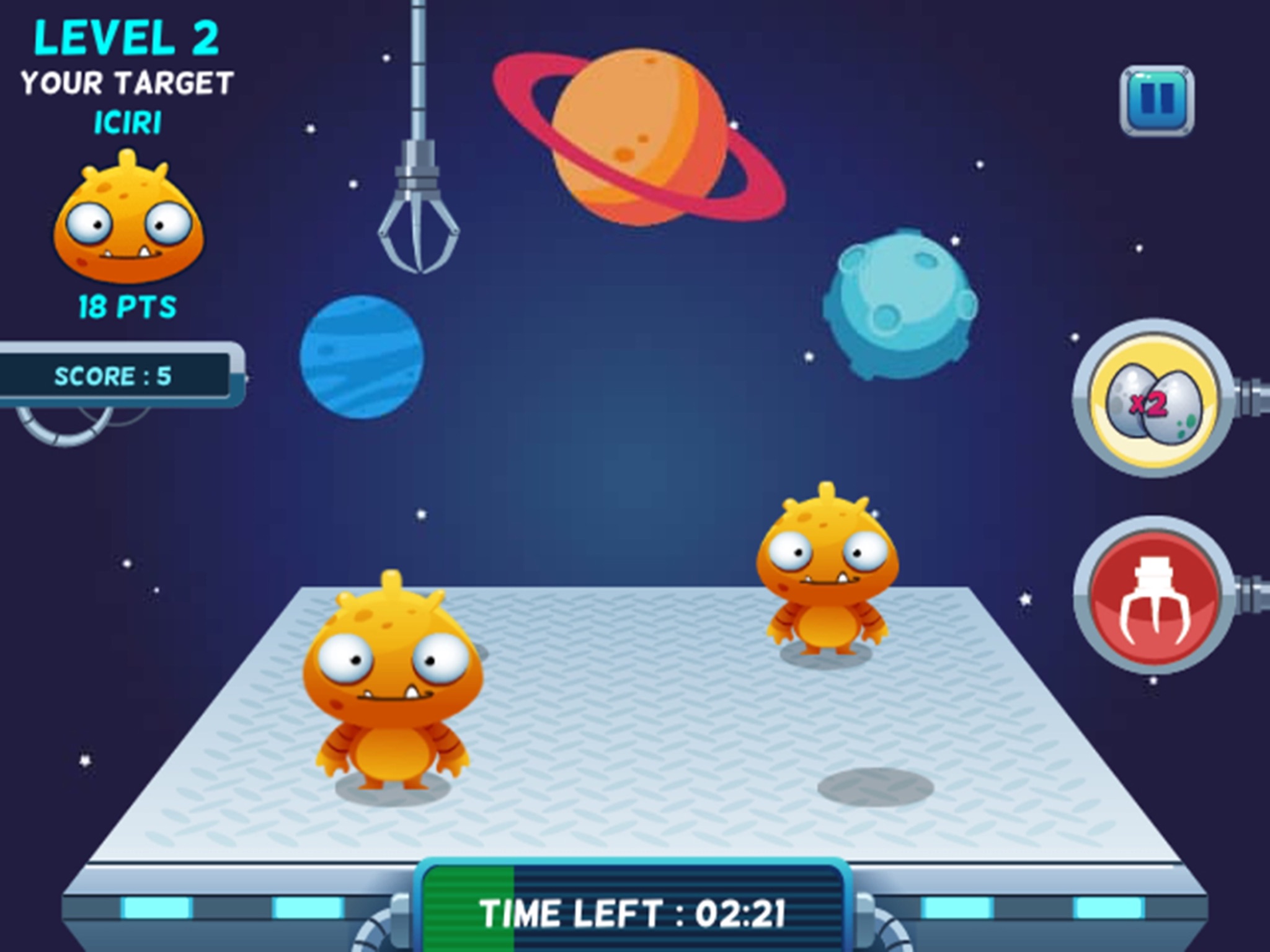 各种各样的外星人娃娃等着你来抓取,游戏时间有限,在时间耗尽之前抓到更多的娃娃吧!要注意指定的娃娃能够获取更高的分数,还会有许多的道具可以帮助你更快抓取更多娃娃哦!