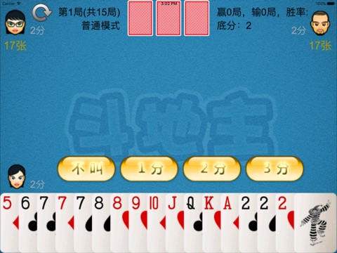 叫牌:3个玩家依次叫牌,可以叫1分、2分、3分或不叫,一轮后叫的最大的为地主。地主获得三张底牌(三张底牌所有人都能看到)。