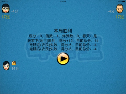 游戏共15局,前9局为普通模式,后6局为加倍模式。15局打完,得分最高的玩家为最终胜利者。