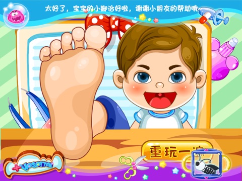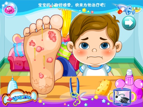 情景一:宝宝的小脚出现了一些小病症,找到对应治疗的小工具进行治疗,全部治愈后进入下一关。