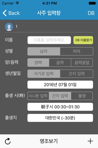 2) 출생지역 선택 기능(출생시각 자동보정)