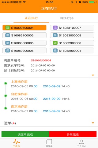 运输过程中如果遇到异常,司机可以上报异常信息,调度人员会根据上报的异常信息及时处理。调度任务完成后,司机可以通过调度单管理看到自己已经完成的所有调度任务。