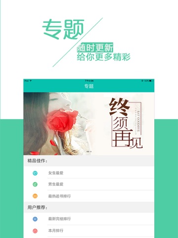 2.多种维度的排行设置,完结榜、追书榜,点击榜、最人气的内容第一时间呈现您的面前。