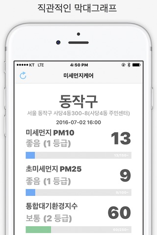 현재위치에서 가장 가까운 측정소를 자동으로 찾아 당신이 원하는 정보를 한눈에 인지 할수 있게 미세먼지(PM10), 초미세먼지(PM25), 통합대기지수(CAI) 정보를 실시간으로 빠르게 제공하고 있습니다.