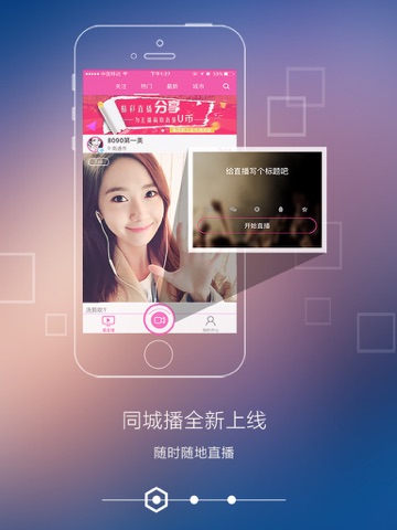 同城播,一个聚集同城超高颜值和才艺的美女帅哥、本地红人、辣妈萌妹、校花校草、本地活动的手机直播社交平台,这里 有本地美景、才艺展示、生活趣闻、花边奇闻、聊天互动、唱歌跳舞...,同一个城市,遇到他或她。