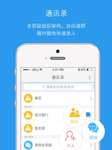 *通讯录:企业完整的组织架构分级展现,还支持权限管理,轻松管理企业机密。
