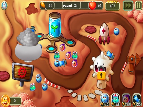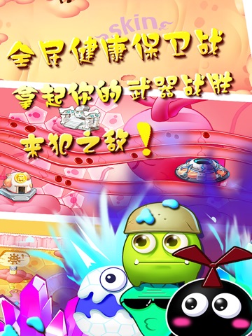 游戏共分为七个主战斗场景,分别用卡通画风模式对应人体的体表、体内各部位,画风风趣幽默,战斗紧张激烈,并十分考验玩家的塔防摆放策略和特殊塔防NPC技能的使用技巧。