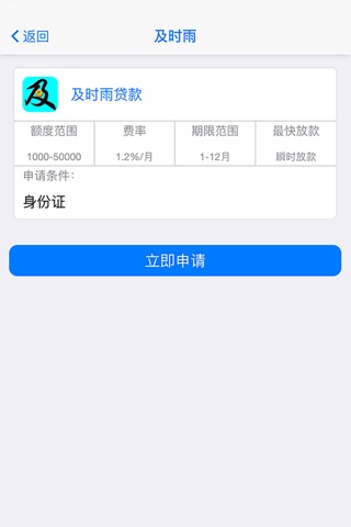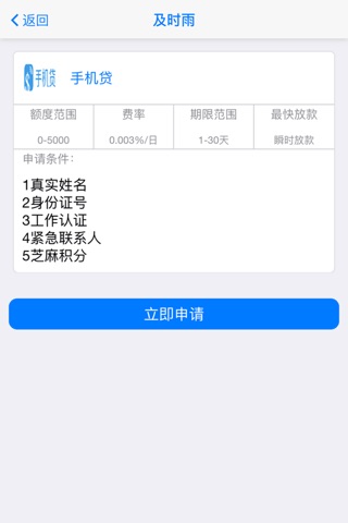 及时雨极速版,纯线上贷款搜索引擎,为借款人提供专业的贷款搜索比价服务,帮助借款人,足不出户,低成本的完成贷款。