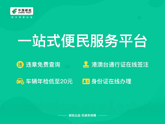 邮证APP提供广东港澳签注、EMS揽收,赴台签注、机动车号牌邮寄办理、全国交通违章查询办理、车辆年检、驾照查分等服务,是一个高效、安全、便捷的便民服务平台。