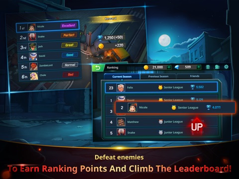 Heroes increase their level by farming items and hunting minion zombies. Zombie Kings increase their power by farming items and through Fever Time at the end of match. As the number of minion zombies increases, the battle becomes more intense!