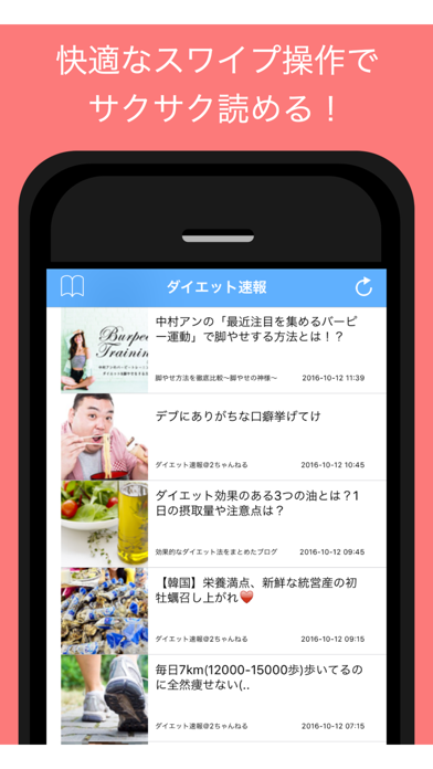 流行のダイエット方法や話題のヘルシーフードまでこのアプリで全てまとめてチェックできます。