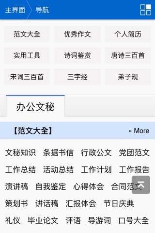 各种日常写作指导,同时提供范文参考。主要栏目有:范文大全、个人简历、教案下载、课件中心、 优秀作文、考试辅导、试题库、诗词鉴赏。