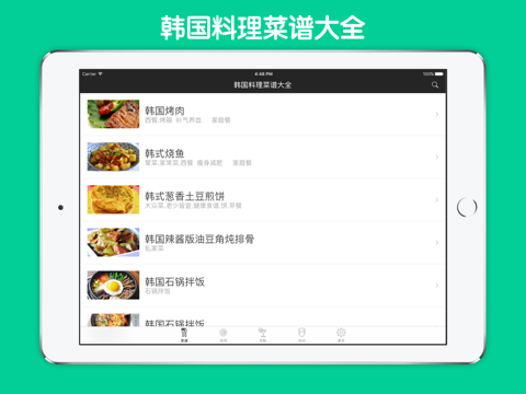 全球美食精品荟萃,发掘各类美食菜谱,蒸煮焖烩炒煎炸,从家常菜到人气料理,从正餐到甜点,从养生汤到减肥餐,搜集美食智慧,品评美食文化,体会美食乐趣。《韩国料理菜谱大全》,简单的名字,幸福的滋味!海量不同菜系菜谱,满足您的个性化需求!