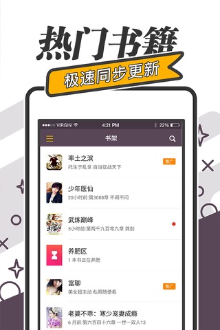 并实时跨站搜索全网线上热门小说,与我吃西红柿、耳根、辰东、天蚕土豆、猫腻、唐家三少、烽火戏诸侯、风凌天下、梦入神机、六月浩雪、苏小暖、丁墨、西子情、桐华、顾漫、蒋胜男等高人气作家更新云同步。更有贴心的实时更新提醒功能,一键打开就可以阅读到最新章节。