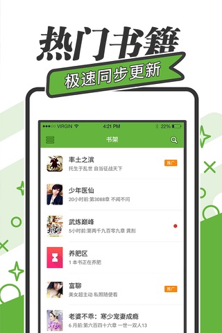 并实时跨站搜索全网线上热门小说,与我吃西红柿、耳根、辰东、天蚕土豆、猫腻、唐家三少、烽火戏诸侯、风凌天下、梦入神机、六月浩雪、苏小暖、丁墨、西子情、桐华、顾漫、蒋胜男等高人气作家更新云同步。更有贴心的实时更新提醒功能,一键打开就可以阅读到最新章节。