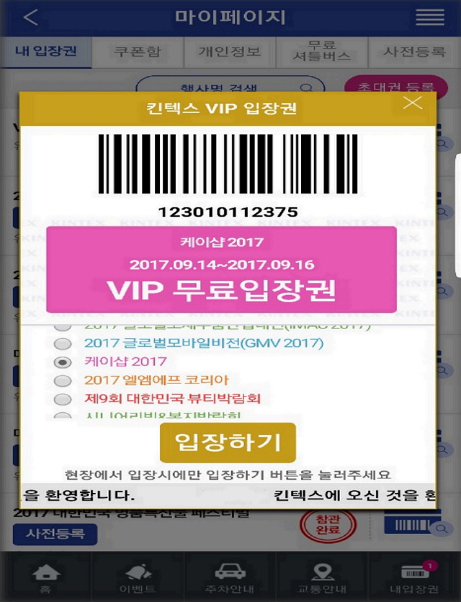 - 2017 킨텍스 주관전시 무료 입장 가능한 VIP 입장권 제공 (이벤트에 따라 대상자에게만 발급)