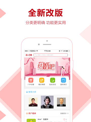 高人合婚是高人汇旗下的一款专业的婚恋情感预测手机应用。数百名知名周易婚姻算命大师真人在线1对1为您批八字、测姻缘、合八字婚配、测感情促婚姻。