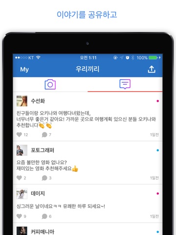 즐거운 이야기, 신나는 이야기, 슬픈 이야기 모두를 사진과 글로 나누세요.