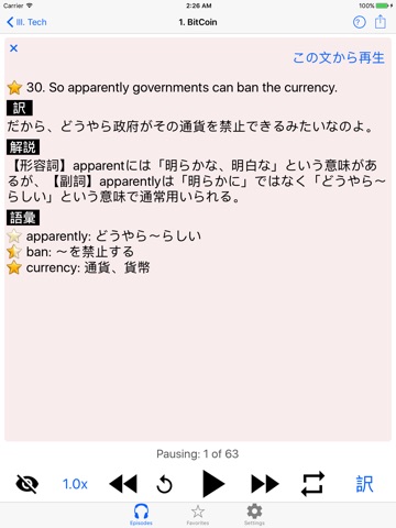 英文のシングル・タップで音声の再生/一時停止、ダブル・タップで日本語訳や語彙リストを表示することができます。