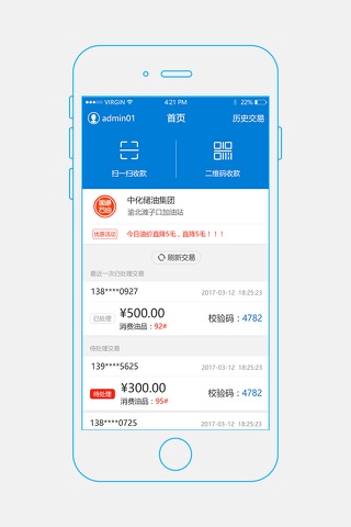 配合国通石油民营加油站系统使用,支持民营加油站的操作人员通过商户端App完成“扫一扫/二维码”收款、交易查询、交易处理、操作日志查询等商户收单和业务处理功能。