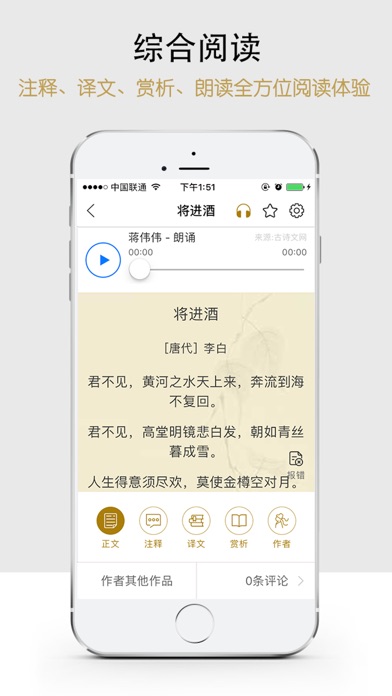 包括唐诗、宋词、元曲、古诗、楚辞、全唐诗、全宋词,同时还提供诗词的注解、释义、赏析和用户品鉴,同时支持诗词朗诵为您提供全方位的体验。