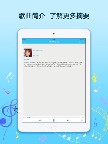 去KTV还是只会唱中文歌?没有考试就不想学习英语,缺乏兴趣?快来听歌学英语吧,嗓音甜美的美女主播为你逐句讲解英文歌曲,让你提高英语学习兴趣,使你在一个轻松、欢快的氛围中学习英语。在听读原汁原味的英文歌曲的同时,飞速地提高英语的听读能力,快乐地学习英语词汇,语法和用法。优美的音乐,炫酷的界面,让你在听觉和视觉上获得充分的愉悦。