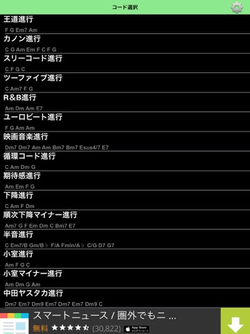 ・有名なコード進行のサンプルを、ピアノロール表示とともに、音(パッド/ピアノ)で聞くことができます。