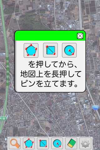 ・地図上を長押ししてピンを立てていき、多角形・四角形・円形の領域の面積測定ができます。