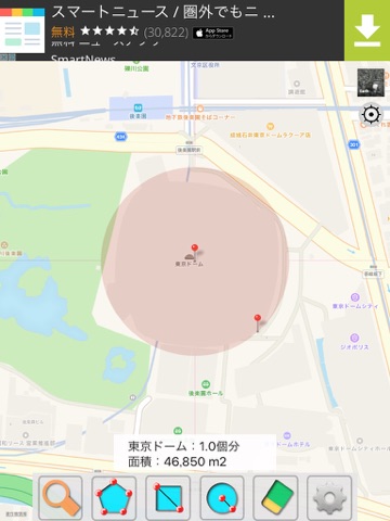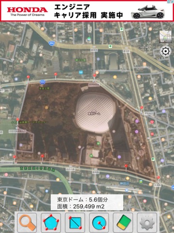 ・地図上の面積を測定できます。また、その面積が東京ドーム何個分か分かります。