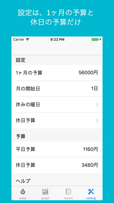 月の予算と、お金を使う毎に金額を登録するだけ。