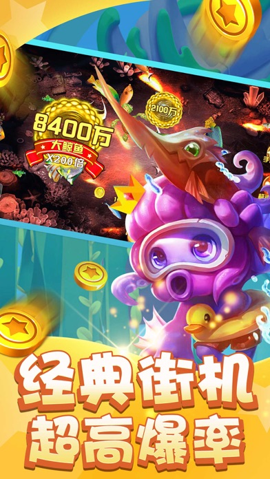 3D海景华丽酷炫,百种鱼类任你捕杀,每日豪礼轻松赢取,超高爆率全屏掉宝,越玩越爽,越玩越爆!