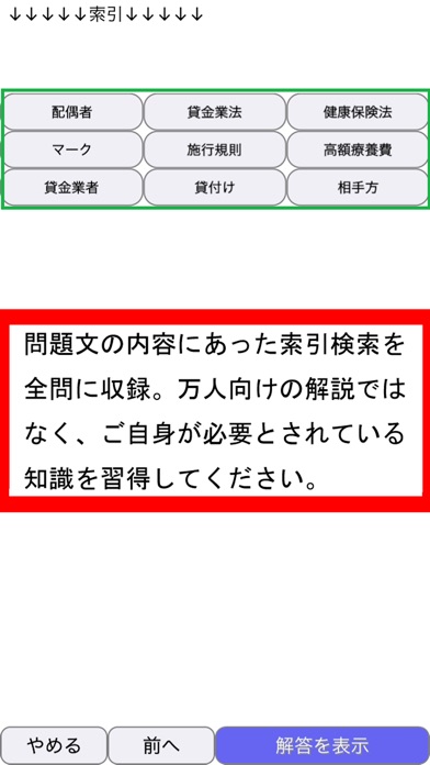 当アプリには、解説は収録していませんが、インターネットと連携した「索引検索機能」を全問に搭載しております。