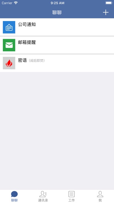 聊聊:公司通知 邮件提醒 密语(阅后即焚)单聊 群聊