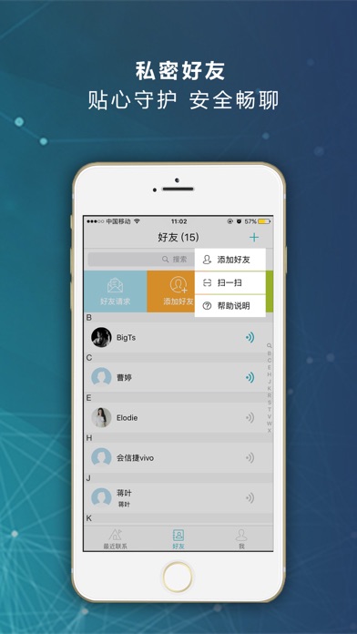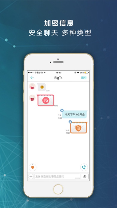 商务密语具有流畅稳定的语音电话, 通话可在WiFi与3G,4G网络间无缝换网,且通话不中断。好友间的聊天消息(语音、图片、文字、视频 )可以阅后即焚,也可以端到端加密。商务密语注重隐私保护,只需用昵称和密码,简单注册即可;采用列表式通讯录,具有备注功能,如有找回密码需求时,才需要绑定一个手机号码;不获取用户的手机通讯录,不进行通讯录匹配,为需要隐私空间的商务人士提供一个绝对安全的交流环境。