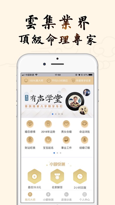 易问大师重新构建了命理咨询服务的每个环节,让服务过程更加即时、高效、快捷、人性,整合产业各方有力资源,成功为民俗文化行业迈入知识付费时代拉开大幕。