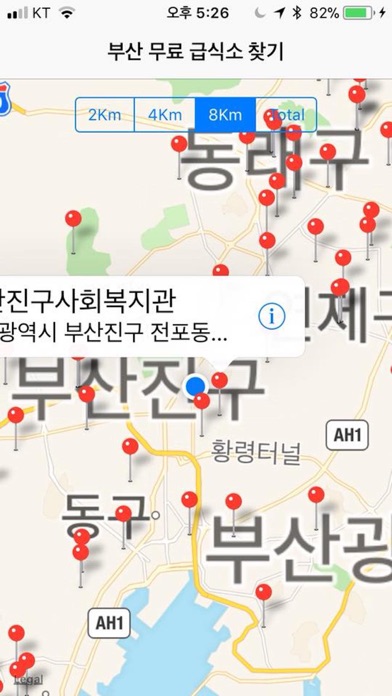 3. 현재 위치에서 반경 2Km, 4Km, 8Km 반경 내의 무료급식소 위치 찾기 제공