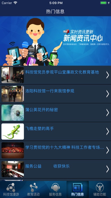 科技馆助手主要分成5个模块,分别是科技馆漫游、教育活动、服务信息、热门信息和辅助功能。