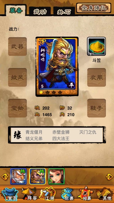 《江湖大掌门》是一款以古典武侠为题材,复合RPG+策略玩法的卡牌大作,一经推出就大受欢迎。游戏中精美的人物设计、酷炫的武功特效重现畅快淋漓的招式,独具匠心的奇遇系统更是让玩家赞不绝口,你将有机会带领泡妞高手韦爵爷、古灵精怪敏郡主、顶天立地乔帮主等二百余位武林豪杰逐鹿中原,问鼎江湖。