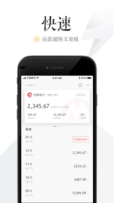 快速:通过精心的app底层的深层优化及网络优化,为用户提供提供快速的信用还款,取现,管理等操作;