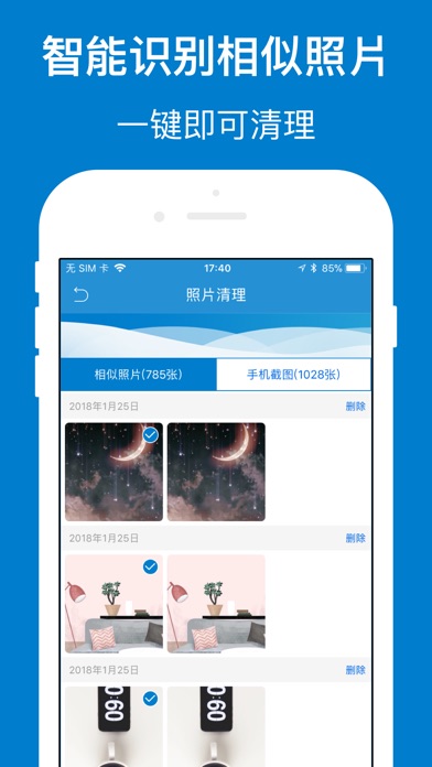 随时打开App查看手机的空间使用情况,随时清理相似照片、手机截图!