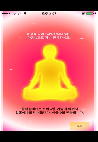사랑해명상은 정신적인 스판다를 이용한 정화법과 차크라 명상법, 오라 명상법, 다차원적인 신지학 접근 방법을 통합한 토탈 메디테이션입니다. 앉아서 가만히 듣기만 하면 정화기능이 절로 일어나고 자동으로 에너지와 의식을 진보시키는 사랑해명상은 하루 10분 정도 앱을 틀어놓고 들으면서 수련할 수 있는 간편한 명상법입니다. 금전의 이익, 마음의 평화, 자기계발이 저절로 되어집니다.