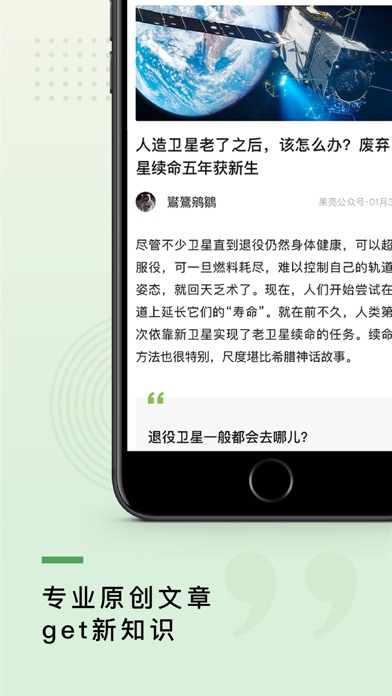 【果壳】是果壳推出的知识阅读应用,从“夸克”那么点小屁事儿,到“宇宙”那么天大的事都要和你说一说。果壳每天都源源不断地产出有趣的科普,刷牙不知道该沾水还是干刷?果壳告诉你。 喝咖啡又怕会让胸变小?果壳有辟谣。 追番煲剧但并不想知道进击的巨人为什么只能内八字少女跑?别躲,果壳要强行科普!2020重大科学事件有哪些,中国何时能成功探测火星,果壳带你追热点。