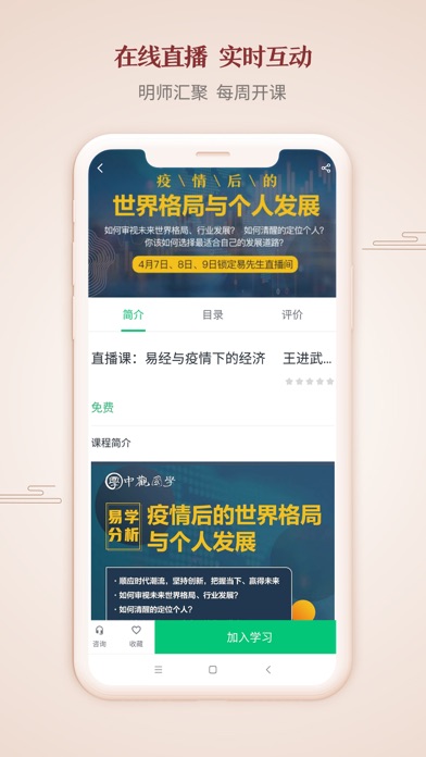 2、免费直播:国内外优秀易学明师在线直播,教授用户如何系统学习并将理论学以致用。用户可与老师在线互动,老师免费答疑。