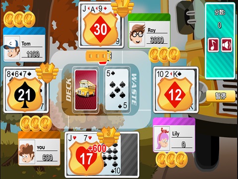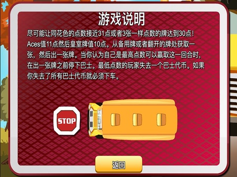 尽可能让同花色的点数接近31点或者3张一样点数的牌达到30点!Aces值11点然后皇室牌值10点。从备用牌或者翻开的牌处获取一张,然后出一张牌。当你认为自己是最高点数可以赢取这一回合时,在出一张牌之前停下巴士。最低点数的玩家失去一个巴士代币。如果你失去了所有巴士代币就必须下车。